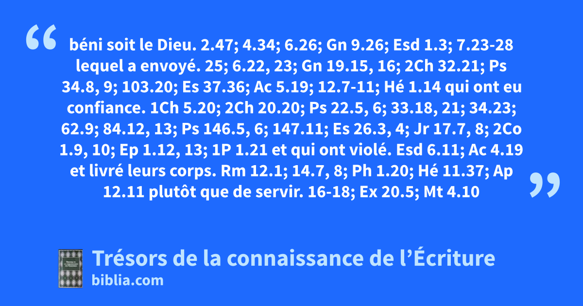 béni soit le Dieu. 2.47; 4.34; 6.26; Gn 9.26; Esd 1.3; 7.23-28 lequel a envoyé. 25; 6.22, 23; Gn 19.15, 16; 2Ch 32.21; Ps 34.8, 9; 103.20; Es 37.36; Ac 5.19; 12.7-11; Hé 1.14 qui ont eu confiance. 1Ch 5.20; 2Ch 20.20; Ps 22.5, 6; 33.18, 21; 34.23; 62.9; 84.12, 13; Ps 146.5, 6; 147.11; Es 26.3, 4; Jr 17.7, 8; 2Co 1.9, 10; Ep 1.12, 13; 1P 1.21 et qui ont violé. Esd 6.11; Ac 4.19 et livré leurs corps. Rm 12.1; 14.7, 8; Ph 1.20; Hé 11.37; Ap 12.11 plutôt que de servir. 16-18; Ex 20.5; Mt 4.10