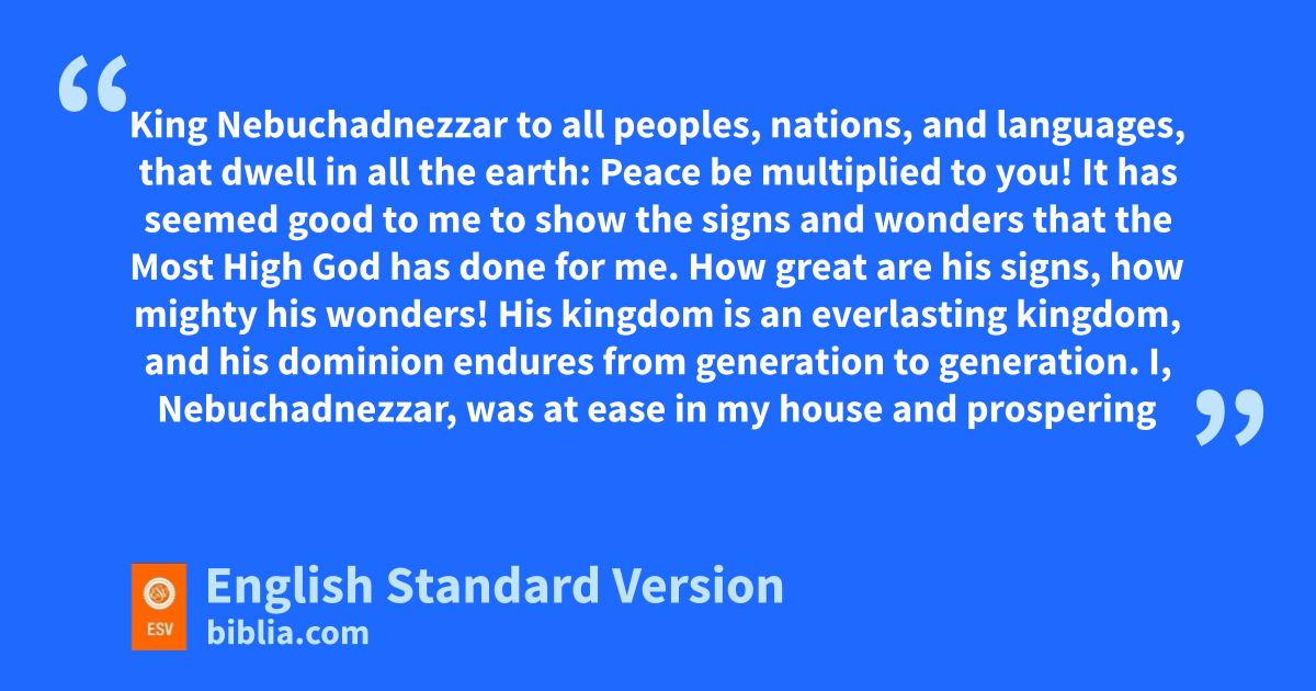 4 1 King Nebuchadnezzar to all mpeoples, nations, and languages, nthat dwell in all the earth: oPeace be multiplied to you! 2 It has seemed good to me to show the psigns and wonders that the qMost High God has done for me.