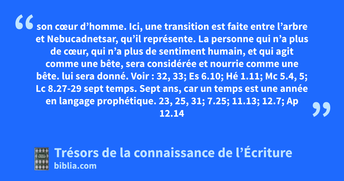 son cœur d’homme. Ici, une transition est faite entre l’arbre et Nebucadnetsar, qu’il représente. La personne qui n’a plus de cœur, qui n’a plus de sentiment humain, et qui agit comme une bête, sera considérée et nourrie comme une bête. lui sera donné. Voir : 32, 33; Es 6.10; Hé 1.11; Mc 5.4, 5; Lc 8.27-29 sept temps. Sept ans, car un temps est une année en langage prophétique. 23, 25, 31; 7.25; 11.13; 12.7; Ap 12.14