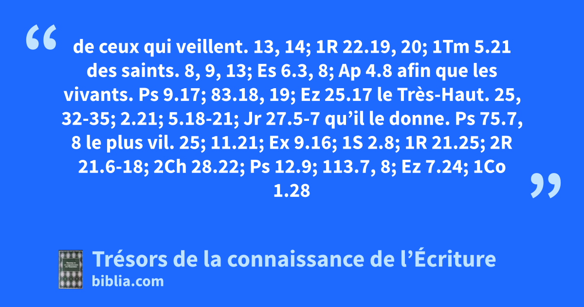 de ceux qui veillent. 13, 14; 1R 22.19, 20; 1Tm 5.21 des saints. 8, 9, 13; Es 6.3, 8; Ap 4.8 afin que les vivants. Ps 9.17; 83.18, 19; Ez 25.17 le Très-Haut. 25, 32-35; 2.21; 5.18-21; Jr 27.5-7 qu’il le donne. Ps 75.7, 8 le plus vil. 25; 11.21; Ex 9.16; 1S 2.8; 1R 21.25; 2R 21.6-18; 2Ch 28.22; Ps 12.9; 113.7, 8; Ez 7.24; 1Co 1.28