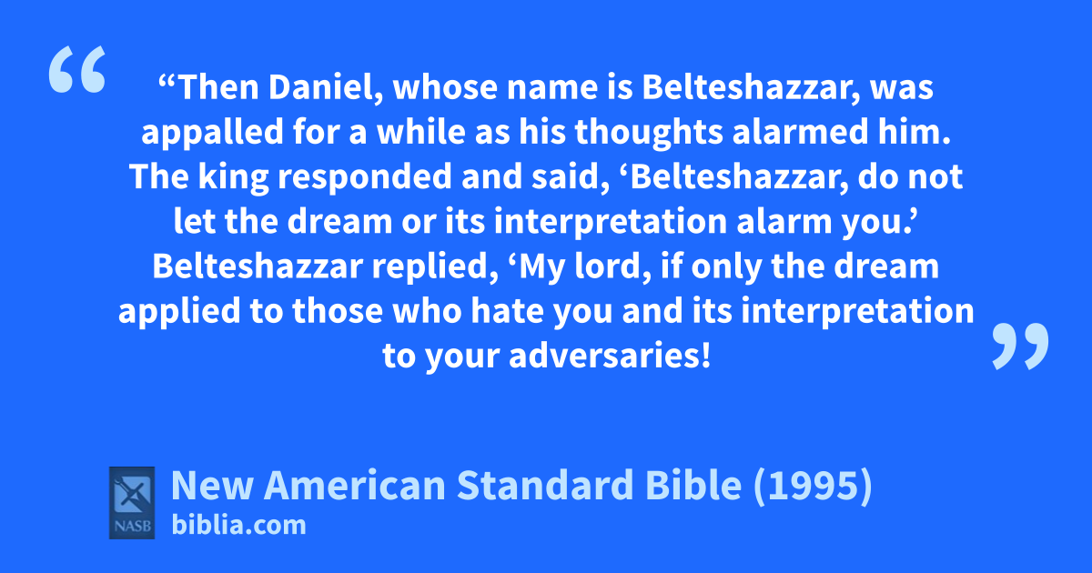 19 “Then Daniel, whose name is Belteshazzar, was appalled for a while as his athoughts alarmed him. The king responded and said, ‘Belteshazzar, do not blet the dream or its interpretation alarm you.’ Belteshazzar replied, ‘cMy lord, if only the dream applied to those who hate you and its interpretation to dyour adversaries!
