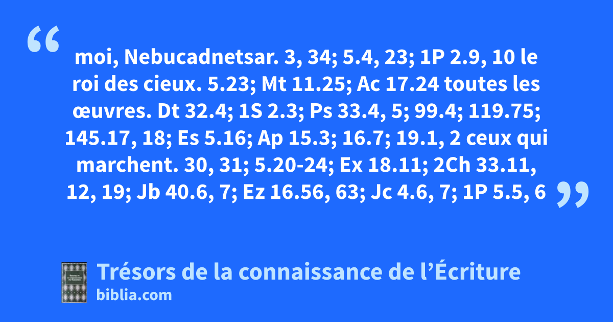 moi, Nebucadnetsar. 3, 34; 5.4, 23; 1P 2.9, 10 le roi des cieux. 5.23; Mt 11.25; Ac 17.24 toutes les œuvres. Dt 32.4; 1S 2.3; Ps 33.4, 5; 99.4; 119.75; 145.17, 18; Es 5.16; Ap 15.3; 16.7; 19.1, 2 ceux qui marchent. 30, 31; 5.20-24; Ex 18.11; 2Ch 33.11, 12, 19; Jb 40.6, 7; Ez 16.56, 63; Jc 4.6, 7; 1P 5.5, 6