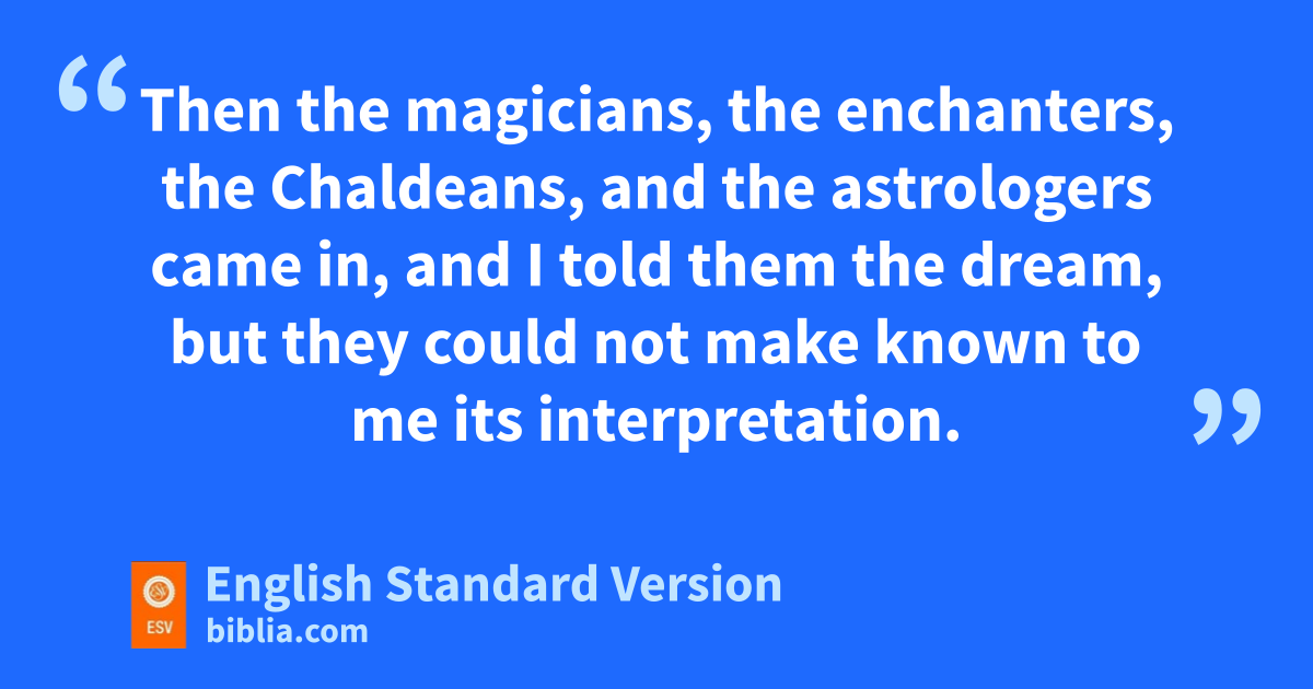 4 2 I, Nebuchadnezzar, was at ease in my house and prospering in my palace. 5 I saw a dream that made me afraid. As I lay in bed the fancies and sthe visions of my head alarmed me. 6 So tI made a decree that uall the wise men of Babylon should be brought before me, that they might make known to me the interpretation of the dream. 7 Then vthe magicians, the enchanters, the Chaldeans, and the astrologers came in, and I told them the dream, but wthey could not make known to me its interpretation. 8 At last Daniel came in before me—he who was named xBelteshazzar after the name of my god, and in whom is ythe spirit of the holy gods3—and I told him the dream, saying, 9 “O Belteshazzar, zchief of the magicians, because I know that ythe spirit of the holy gods is in you and that no amystery is too difficult for you, tell me sthe visions of my dream that I saw and their interpretation. 10 sThe visions of my head as I lay in bed were these: I saw, and bbehold, a tree in the midst of the earth, and its height was great. 11 cThe tree grew and became strong, and its top reached to heaven, and it was visible to the end of the whole earth. 12 dIts leaves were beautiful and its fruit abundant, and in it was food for all. eThe beasts of the field found shade under it, and ethe birds of the heavens lived in its branches, and all flesh was fed from it.