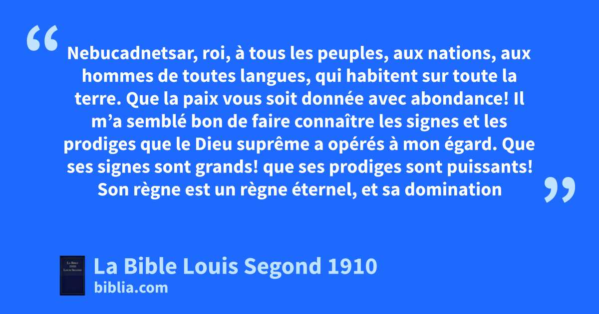 1Nebucadnetsar, roi, à tous les peuples, aux nations, aux hommes de toutes langues, qui habitent sur toute la terre. Que la paix vous soit donnée avec abondance! 2Il m’a semblé bon de faire connaître les signes et les prodiges que le Dieu suprême a opérés à mon égard. 3Que ses signes sont grands! que ses prodiges sont puissants! aSon règne est un règne éternel, et sa domination subsiste de génération en génération. 4Moi, Nebucadnetsar, je vivais tranquille dans ma maison, et heureux dans mon palais. 5J’ai eu un songe qui m’a effrayé; les pensées dont j’étais poursuivi sur ma couche et les visions de mon esprit me remplissaient d’épouvante. 6J’ordonnai qu’on fît venir devant moi tous les sages de Babylone, afin qu’ils me donnassent l’explication du songe. 7Alors vinrent les magiciens, les astrologues, les Chaldéens et les devins. Je leur dis le songe, et ils ne m’en donnèrent point l’explication. 8En dernier lieu, se présenta devant moi Daniel, nommé Beltschatsar d’après le nom de mon dieu, et qui a en lui l’esprit des dieux saints. Je lui dis le songe: 9Beltschatsar, chef des magiciens, qui as en toi, je le sais, l’esprit des dieux saints, et pour qui aucun secret n’est difficile, donne-moi l’explication des visions que j’ai eues en songe. 10Voici les visions de mon esprit, pendant que j’étais sur ma couche. Je regardais, et voici, il y avait au milieu de la terre un arbre d’une grande hauteur. 11Cet arbre était devenu grand et fort, sa cime s’élevait jusqu’aux cieux, et on le voyait des extrémités de toute la terre. 12Son feuillage était beau, et ses fruits abondants; il portait de la nourriture pour tous; les bêtes des champs s’abritaient sous son ombre, les oiseaux du ciel faisaient leur demeure parmi ses branches, et tout être vivant tirait de lui sa nourriture. 13Dans les visions de mon esprit, que j’avais sur ma couche, je regardais, et voici, un de ceux qui veillent et qui sont saints descendit des cieux. 14Il cria avec force et parla ainsi: Abattez l’arbre, et coupez ses branches; secouez le feuillage, et dispersez les fruits; que les bêtes fuient de dessous, et les oiseaux du milieu de ses branches! 15Mais laissez en terre le tronc où se trouvent les racines, et liez-le avec des chaînes de fer et d’airain, parmi l’herbe des champs. Qu’il soit trempé de la rosée du ciel, et qu’il ait, comme les bêtes, l’herbe de la terre pour partage. 16Son coeur d’homme lui sera ôté, et un coeur de bête lui sera donné; et sept temps passeront sur lui. 17Cette sentence est un décret de ceux qui veillent, cette résolution est un ordre des saints, afin que les vivants sachent que le Très-Haut domine sur le règne des hommes, qu’il le donne à qui il lui plaît, et qu’il y élève le plus vil des hommes. 18Voilà le songe que j’ai eu, moi, le roi Nebucadnetsar. Toi, Beltschatsar, donnes-en l’explication, puisque tous les sages de mon royaume ne peuvent me la donner; toi, tu le peux, car tu as en toi l’esprit des dieux saints. 19Alors Daniel, nommé Beltschatsar, fut un moment stupéfait, et ses pensées le troublaient. Le roi reprit et dit: Beltschatsar, que le songe et l’explication ne te troublent pas! Et Beltschatsar répondit: Mon seigneur, que le songe soit pour tes ennemis, et son explication pour tes adversaires! 20L’arbre que tu as vu, qui était devenu grand et fort, dont la cime s’élevait jusqu’aux cieux, et qu’on voyait de tous les points de la terre; 21cet arbre, dont le feuillage était beau et les fruits abondants, qui portait de la nourriture pour tous, sous lequel s’abritaient les bêtes des champs, et parmi les branches duquel les oiseaux du ciel faisaient leur demeure, 22c’est toi, ô roi, qui es devenu grand et fort, dont la grandeur s’est accrue et s’est élevée jusqu’aux cieux, et dont la domination s’étend jusqu’aux extrémités de la terre. 23Le roi a vu l’un de ceux qui veillent et qui sont saints descendre des cieux et dire: Abattez l’arbre, et détruisez-le; mais laissez en terre le tronc où se trouvent les racines, et liez-le avec des chaînes de fer et d’airain, parmi l’herbe des champs; qu’il soit trempé de la rosée du ciel, et que son partage soit avec les bêtes des champs, jusqu’à ce que sept temps soient passés sur lui. 24Voici l’explication, ô roi, voici le décret du Très-Haut, qui s’accomplira sur mon seigneur le roi. 25bOn te chassera du milieu des hommes, tu auras ta demeure avec les bêtes des champs, et l’on te donnera comme aux boeufs de l’herbe à manger; tu seras trempé de la rosée du ciel, et sept temps passeront sur toi, jusqu’à ce que tu saches que le Très-Haut domine sur le règne des hommes et qu’il le donne à qui il lui plaît. 26L’ordre de laisser le tronc où se trouvent les racines de l’arbre signifie que ton royaume te restera quand tu reconnaîtras que celui qui domine est dans les cieux. 27C’est pourquoi, ô roi, puisse mon conseil te plaire! mets un terme à tes péchés en pratiquant la justice, et à tes iniquités en usant de compassion envers les malheureux, et ton bonheur pourra se prolonger.
