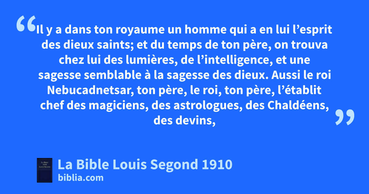 1Le roi Belschatsar donna un grand festin à ses grands au nombre de mille, et il but du vin en leur présence. 2Belschatsar, quand il eut goûté au vin, fit apporter les vases d’or et d’argent que son père Nebucadnetsar avait enlevés du temple de Jérusalem, afin que le roi et ses grands, ses femmes et ses concubines, s’en servissent pour boire. 3Alors on apporta les vases d’or qui avaient été enlevés du temple, de la maison de Dieu à Jérusalem; et le roi et ses grands, ses femmes et ses concubines, s’en servirent pour boire. 4Ils burent du vin, et ils louèrent les dieux d’or, d’argent, d’airain, de fer, de bois et de pierre. 5En ce moment, apparurent les doigts d’une main d’homme, et ils écrivirent, en face du chandelier, sur la chaux de la muraille du palais royal. Le roi vit cette extrémité de main qui écrivait. 6Alors le roi changea de couleur, et ses pensées le troublèrent; les jointures de ses reins se relâchèrent, et ses genoux se heurtèrent l’un contre l’autre. 7Le roi cria avec force qu’on fît venir les astrologues, les Chaldéens et les devins; et le roi prit la parole et dit aux sages de Babylone: Quiconque lira cette écriture et m’en donnera l’explication sera revêtu de pourpre, portera un collier d’or à son cou, et aura la troisième place dans le gouvernement du royaume. 8Tous les sages du roi entrèrent; mais ils ne purent pas lire l’écriture et en donner au roi l’explication. 9Sur quoi le roi Belschatsar, fut très effrayé, il changea de couleur, et ses grands furent consternés. 10La reine, à cause des paroles du roi et de ses grands, entra dans la salle du festin, et prit ainsi la parole: O roi, vis éternellement! Que tes pensées ne te troublent pas, et que ton visage ne change pas de couleur! 11Il y a dans ton royaume un homme qui a en lui l’esprit des dieux saints; et adu temps de ton père, on trouva chez lui des lumières, de l’intelligence, et une sagesse semblable à la sagesse des dieux. Aussi le roi Nebucadnetsar, ton père, le roi, ton père, l’établit chef des magiciens, des astrologues, des Chaldéens, des devins, 12parce qu’on trouva chez lui, chez Daniel, nommé par le roi Beltschatsar, un esprit supérieur, de la science et de l’intelligence, la faculté d’interpréter les songes, d’expliquer les énigmes, et de résoudre les questions difficiles. Que Daniel soit donc appelé, et il donnera l’explication. 13Alors Daniel fut introduit devant le roi. Le roi prit la parole et dit à Daniel: Es-tu ce Daniel, l’un des captifs de Juda, que le roi, mon père, a amenés de Juda? 14J’ai appris sur ton compte que tu as en toi l’esprit des dieux, et qu’on trouve chez toi des lumières, de l’intelligence, et une sagesse extraordinaire. 15On vient d’amener devant moi les sages et les astrologues, afin qu’ils lussent cette écriture et m’en donnassent l’explication; mais ils n’ont pas pu donner l’explication des mots. 16J’ai appris que tu peux donner des explications et résoudre des questions difficiles; maintenant, si tu peux lire cette écriture et m’en donner l’explication, tu seras revêtu de pourpre, tu porteras un collier d’or à ton cou, et tu auras la troisième place dans le gouvernement du royaume. 17Daniel répondit en présence du roi: Garde tes dons, et accorde à un autre tes présents; je lirai néanmoins l’écriture au roi, et je lui en donnerai l’explication. 18O roi, le Dieu suprême avait donné à Nebucadnetsar, ton père, l’empire, la grandeur, la gloire et la magnificence; 19et à cause de la grandeur qu’il lui avait donnée, tous les peuples, les nations, les hommes de toutes langues étaient dans la crainte et tremblaient devant lui. Le roi faisait mourir ceux qu’il voulait, et il laissait la vie à ceux qu’il voulait; il élevait ceux qu’il voulait, et il abaissait ceux qu’il voulait. 20Mais lorsque son coeur s’éleva et que son esprit s’endurcit jusqu’à l’arrogance, il fut précipité de son trône royal et dépouillé de sa gloire; 21bil fut chassé du milieu des enfants des hommes, son coeur devint semblable à celui des bêtes, et sa demeure fut avec les ânes sauvages; on lui donna comme aux boeufs de l’herbe à manger, et son corps fut trempé de la rosée du ciel, jusqu’à ce qu’il reconnût que le Dieu suprême domine sur le règne des hommes et qu’il le donne à qui il lui plaît. 22Et toi, Belschatsar, son fils, tu n’as pas humilié ton coeur, quoique tu susses toutes ces choses. 23Tu t’es élevé contre le Seigneur des cieux; les vases de sa maison ont été apportés devant toi, et vous vous en êtes servis pour boire du vin, toi et tes grands, tes femmes et tes concubines; tu as loué les dieux d’argent, d’or, d’airain, de fer, de bois et de pierre, qui ne voient point, qui n’entendent point, et qui ne savent rien, et tu n’as pas glorifié le Dieu qui a dans sa main ton souffle et toutes tes voies. 24C’est pourquoi il a envoyé cette extrémité de main qui a tracé cette écriture. 25Voici l’écriture qui a été tracée: Compté, compté, pesé, et divisé. 26Et voici l’explication de ces mots. Compté: Dieu a compté ton règne, et y a mis fin. 27Pesé: Tu as été pesé dans la balance, et tu as été trouvé léger. 28Divisé: Ton royaume sera divisé, et donné aux Mèdes et aux Perses. 29Aussitôt Belschatsar donna des ordres, et l’on revêtit Daniel de pourpre, on lui mit au cou un collier d’or, et on publia qu’il aurait la troisième place dans le gouvernement du royaume. 30Cette même nuit, Belschatsar, roi des Chaldéens, fut tué. 31Et Darius, le Mède, s’empara du royaume, étant âgé de soixante-deux ans.