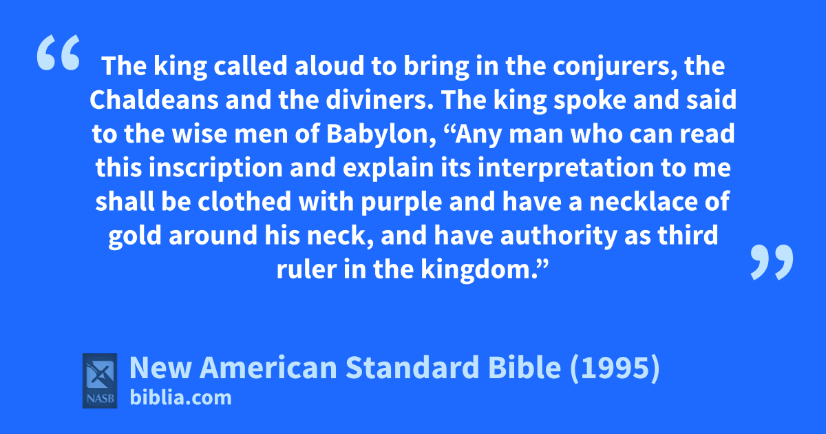 7 The king called aloud to bring in the aconjurers, the 1Chaldeans and the diviners. The king spoke and said to the wise men of Babylon, “Any man who can read this inscription and explain its interpretation to me shall be bclothed with purple and have a cnecklace of gold around his neck, and have authority as 2dthird ruler in the kingdom.”