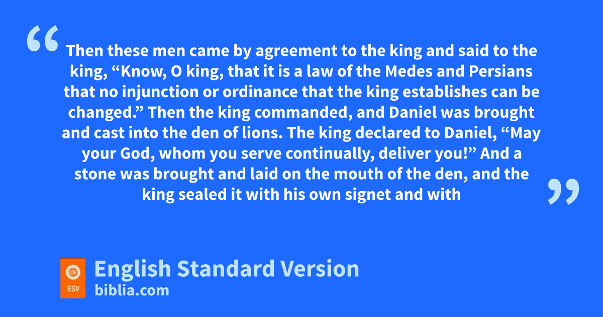19 Then, at break of day, the king arose and went in haste to the den of lions. 20 As he came near to the den where Daniel was, he cried out in a tone of anguish. The king declared to Daniel, “O Daniel, servant of vthe living God, ohas your God, whom you serve continually, wbeen able to deliver you from the lions?” 21 Then Daniel said to the king, x“O king, live forever! 22 My God ysent his angel zand shut the lions’ mouths, and they have not harmed me, because I was found blameless abefore him; aand also before you, O king, I have done no harm.” 23 Then the king was exceedingly glad, and commanded that Daniel be taken up out of the den. So Daniel was taken up out of the den, and bno kind of harm was found on him, because he had trusted in his God. 24 And the king commanded, and cthose men who had maliciously accused Daniel were brought and cast into the den of lions—they, their children, and their wives. And before they reached the bottom of the den, the lions overpowered them and broke all their bones in pieces.