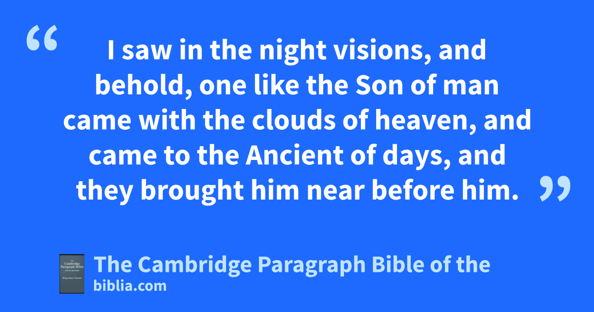 9 I beheld till ythe thrones were cast down, and zthe Ancient of days did sit, awhose garment was bwhite as snow, and athe hair of his head like the pure wool: his throne was like cthe fiery flame, and dhis wheels as burning fire. 10 eA fiery stream issued and came forth from before him: fthousand thousands gministered unto him, and ten thousand times ten thousand ggstood before him: hthe judgment was set, and ithe books were opened. 11 I beheld then because of the voice of kthe great words which the horn spake: I beheld even ltill the beast was slain, and lhis body destroyed, and mgiven to the burning flame. 12 As concerning the rest of the beasts, nthey had their dominion taken away: yet * their lives were prolonged for a season and time. 13 pI saw in the night visions, and behold, one like qrthe Son of man rcame with the clouds of heaven, and came to sthe Ancient of days, and they brought him near before him. 14 And tthere was given him dominion, and glory, and a kingdom, uthat all people, nations, and languages, should serve him: vhis dominion is an everlasting dominion, nwhich shall not pass away, and vhis kingdom that which shall not be destroyed.