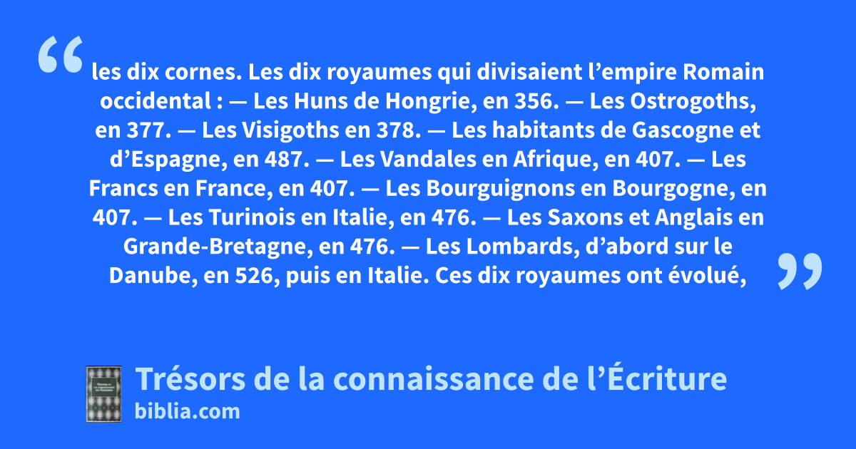 les dix cornes. Les dix royaumes qui divisaient l’empire Romain occidental : — Les Huns de Hongrie, en 356. — Les Ostrogoths, en 377. — Les Visigoths en 378. — Les habitants de Gascogne et d’Espagne, en 487. — Les Vandales en Afrique, en 407. — Les Francs en France, en 407. — Les Bourguignons en Bourgogne, en 407. — Les Turinois en Italie, en 476. — Les Saxons et Anglais en Grande-Bretagne, en 476. — Les Lombards, d’abord sur le Danube, en 526, puis en Italie. Ces dix royaumes ont évolué, mais leurs noms sont encore connus. 8, 11, 23; 8.9-11 une plus grande apparence. 11.36, 37