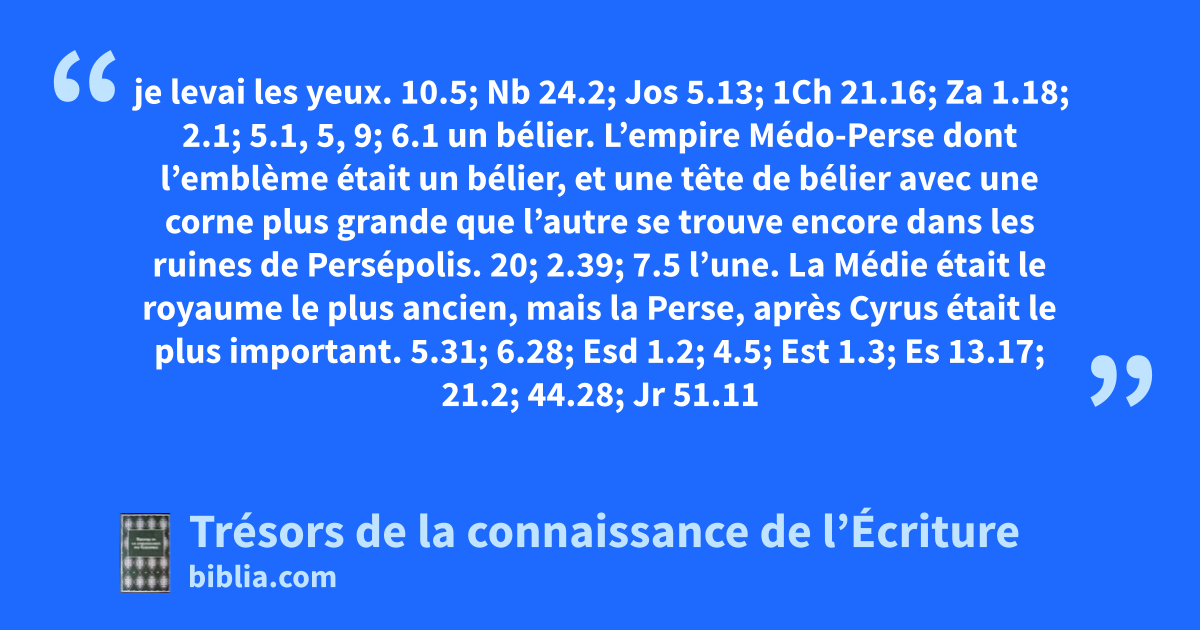 je levai les yeux. 10.5; Nb 24.2; Jos 5.13; 1Ch 21.16; Za 1.18; 2.1; 5.1, 5, 9; 6.1 un bélier. L’empire Médo-Perse dont l’emblème était un bélier, et une tête de bélier avec une corne plus grande que l’autre se trouve encore dans les ruines de Persépolis. 20; 2.39; 7.5 l’une. La Médie était le royaume le plus ancien, mais la Perse, après Cyrus était le plus important. 5.31; 6.28; Esd 1.2; 4.5; Est 1.3; Es 13.17; 21.2; 44.28; Jr 51.11