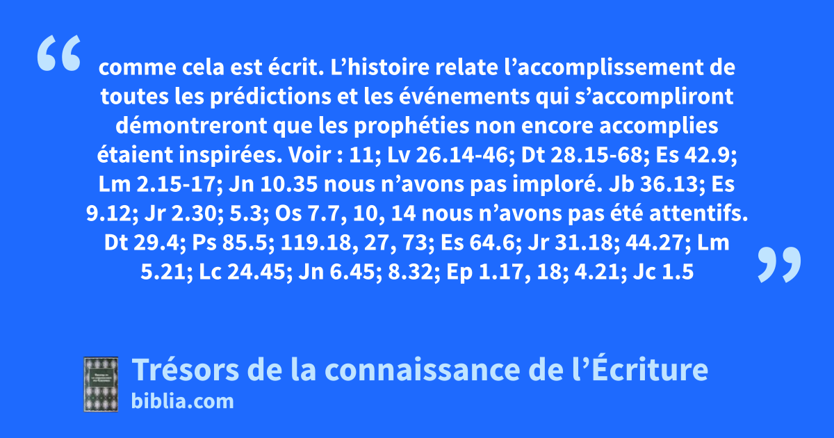 comme cela est écrit. L’histoire relate l’accomplissement de toutes les prédictions et les événements qui s’accompliront démontreront que les prophéties non encore accomplies étaient inspirées. Voir : 11; Lv 26.14-46; Dt 28.15-68; Es 42.9; Lm 2.15-17; Jn 10.35 nous n’avons pas imploré. Jb 36.13; Es 9.12; Jr 2.30; 5.3; Os 7.7, 10, 14 nous n’avons pas été attentifs. Dt 29.4; Ps 85.5; 119.18, 27, 73; Es 64.6; Jr 31.18; 44.27; Lm 5.21; Lc 24.45; Jn 6.45; 8.32; Ep 1.17, 18; 4.21; Jc 1.5