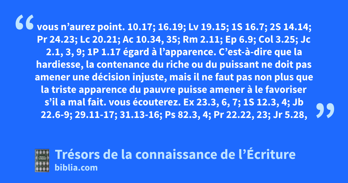 vous n’aurez point. 10.17; 16.19; Lv 19.15; 1S 16.7; 2S 14.14; Pr 24.23; Lc 20.21; Ac 10.34, 35; Rm 2.11; Ep 6.9; Col 3.25; Jc 2.1, 3, 9; 1P 1.17 égard à l’apparence. C’est-à-dire que la hardiesse, la contenance du riche ou du puissant ne doit pas amener une décision injuste, mais il ne faut pas non plus que la triste apparence du pauvre puisse amener à le favoriser s’il a mal fait. vous écouterez. Ex 23.3, 6, 7; 1S 12.3, 4; Jb 22.6-9; 29.11-17; 31.13-16; Ps 82.3, 4; Pr 22.22, 23; Jr 5.28, 29; Am 5.11, 12; Mi 2.1-3; 3.1-4; 7.3, 4; Jc 2.2-4, 5 vous ne craindrez point. 1R 21.8-14; Jb 31.34; Pr 29.25; Jr 1.17; Mt 22.16; Mc 12.14 1Th 2.4 la justice. 2Ch 19.6 une cause. 17.8-10; Ex 18.18, 22, 26