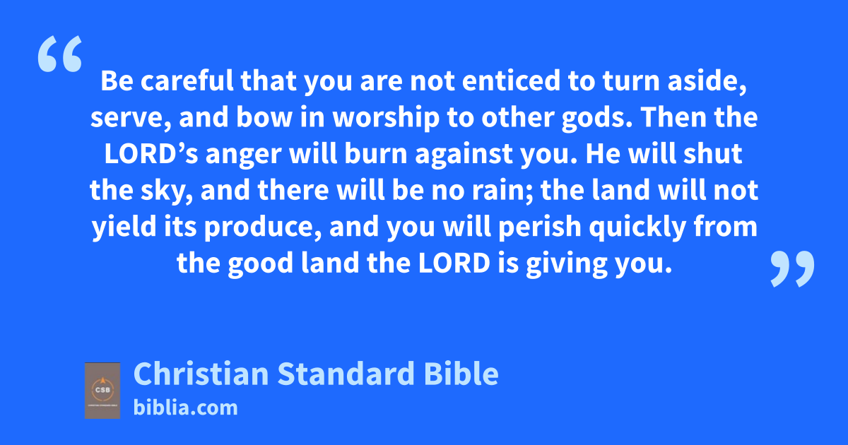 13 “If you carefully obey my commands I am giving you today, to love the Lord your God and worship him with all your heart and all your soul, 14 ID will provide rain for your land in the proper time, the autumn and spring rains,x and you will harvest your grain, new wine, and fresh oil.y 15 IE will provide grass in your fields for your livestock. You will eat and be satisfied.z 16 Be carefulaa that you are not enticed to turn aside, serve, and bow in worship to other gods.ab 17 Then the Lord’s anger will burn against you.ac He will shut the sky, and there will be no rain;ad the land will not yield its produce, and you will perish quickly from the good landae the Lord is giving you.