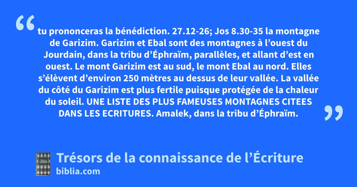 tu prononceras la bénédiction. 27.12-26; Jos 8.30-35 la montagne de Garizim. Garizim et Ebal sont des montagnes à l’ouest du Jourdain, dans la tribu d’Éphraïm, parallèles, et allant d’est en ouest. Le mont Garizim est au sud, le mont Ebal au nord. Elles s’élèvent d’environ 250 mètres au dessus de leur vallée. La vallée du côté du Garizim est plus fertile puisque protégée de la chaleur du soleil. UNE LISTE DES PLUS FAMEUSES MONTAGNES CITEES DANS LES ECRITURES. Amalek, dans la tribu d’Éphraïm. Jg 12.15 Calvaire, (Crâne) près de Jérusalem. Lc 23.33 Carmel, près de la Méditerranée. Jos 19.26 Ebal, près de Garizim. Jos 8.30 En-Guédi, près de la mer Morte. Jos 15.62 Gaasch, dans la tribu d’Éphraïm. Jos 24.30 Guilboa, au sud de la vallée d’Israël. 2S 1.21 Galaad, au delà du Jourdain. Gn 31.21-25 Garizim, où se trouva ensuite un temple de Samaritains. Jg 9.7 Hermon, au delà du Jourdain. Jos 11.3 Hor, en Idumée. Nb 20.22 Horeb, en Arabie, près du Sinaï. Dt 1.2 Liban, séparant Syrie et Palestine. Dt 3.25 Morija, où fut construit le temple. 2Ch 3.1 Nebo, partie des montagnes d’Abarim. Nb 32.3 Oliviers, à l’est de Jérusalem, où coule le Cédron. 1R 11.1, 7; 2R 23.13; Ac 1.12 Paran, en Arabie. Gn 14.6; Dt 1.1 Pisga, au delà du Jourdain. Nb 21.20; Dt 34.1 Séir, en Idumée. Gn 14.6 Sinaï, en Arabie. Ex 19.2; Dt 33.2 Sion, près du mont Morija. 2S 5.7 Thabor, en basse Galilée. Jg 4.6