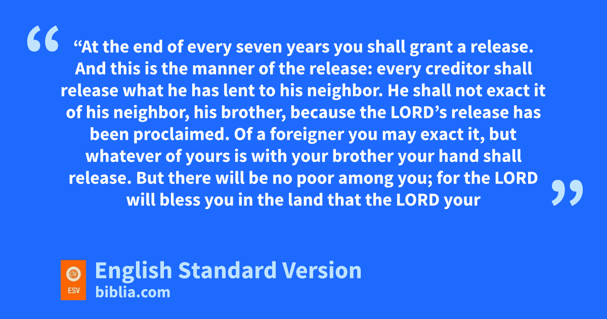 15 “At the end of jevery seven years you shall grant a release. 2 And this is the manner of the release: every creditor shall release what he has lent to his neighbor. He shall not exact it of his neighbor, his brother, because the Lord’s release has been proclaimed. 3 kOf a foreigner you may exact it, but whatever of yours is with your brother your hand shall release. 4 lBut there will be no poor among you; mfor the Lord will bless you in the land that the Lord your God is giving you for an inheritance to possess— 5 nif only you will strictly obey the voice of the Lord your God, being careful to do all this commandment that I command you today. 6 For the Lord your God will bless you, oas he promised you, and pyou shall lend to many nations, but you shall not borrow, and qyou shall rule over many nations, but they shall not rule over you.