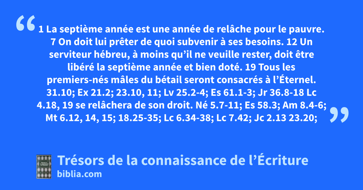 1 La septième année est une année de relâche pour le pauvre. 7 On doit lui prêter de quoi subvenir à ses besoins. 12 Un serviteur hébreu, à moins qu’il ne veuille rester, doit être libéré la septième année et bien doté. 19 Tous les premiers-nés mâles du bétail seront consacrés à l’Éternel.