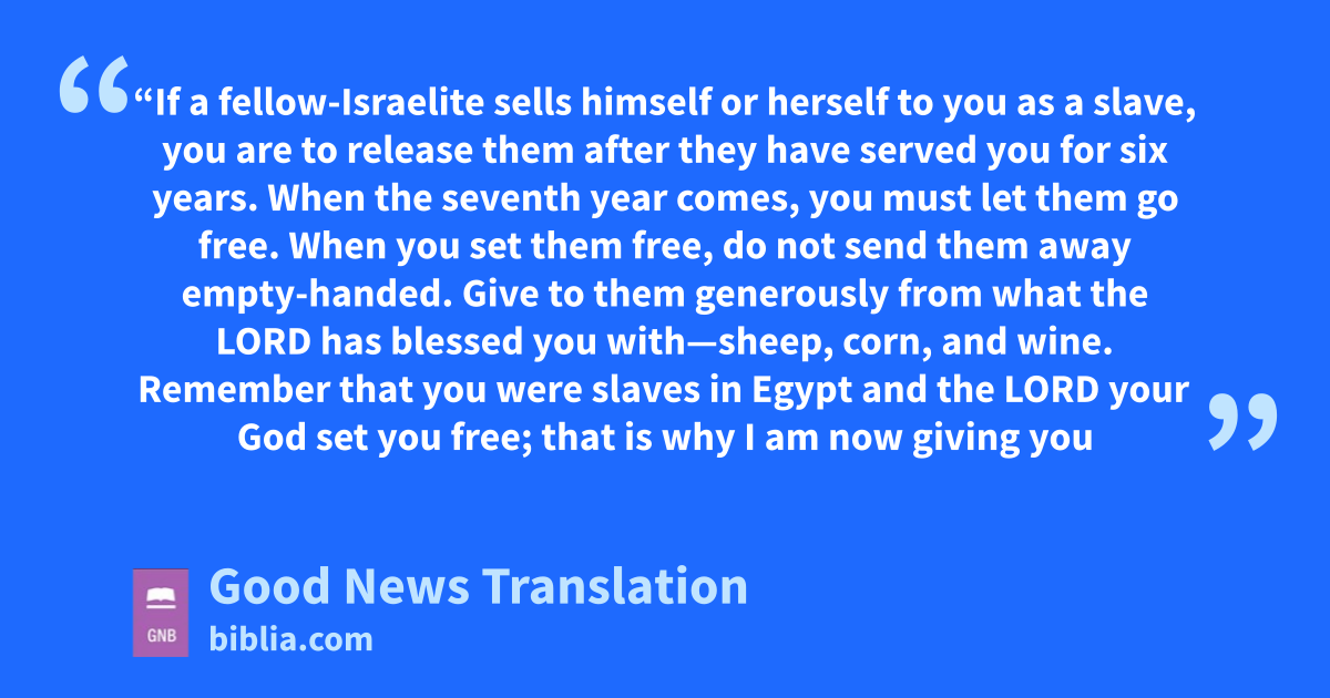12 *“If a fellow-Israelite sells himself or herselfm to you as a slave, you are to release them after they have served you for six years. When the seventh year comes, you must let them go free. 13*When you set them free, do not send them away empty-handed. 14*Give to them generously from what the Lord has blessed you with—sheep, corn, and wine. 15*Remember that you were slaves in Egypt and the Lord your God set you free; that is why I am now giving you this command.