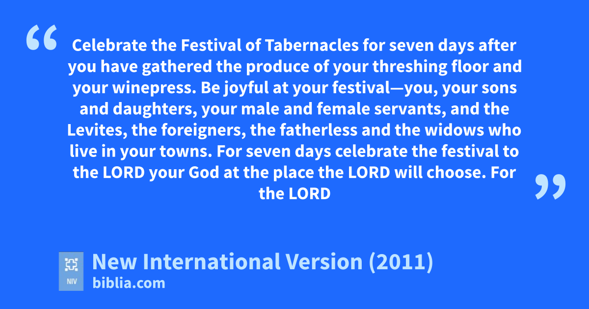 13 Celebrate the Festival of Tabernacles for seven days after you have gathered the produce of your threshing flooro and your winepress.p 14 Be joyfulq at your festival—you, your sons and daughters, your male and female servants, and the Levites, the foreigners, the fatherless and the widows who live in your towns. 15 For seven days celebrate the festival to the Lord your God at the place the Lord will choose. For the Lord your God will bless you in all your harvest and in all the work of your hands, and your joyr will be complete.