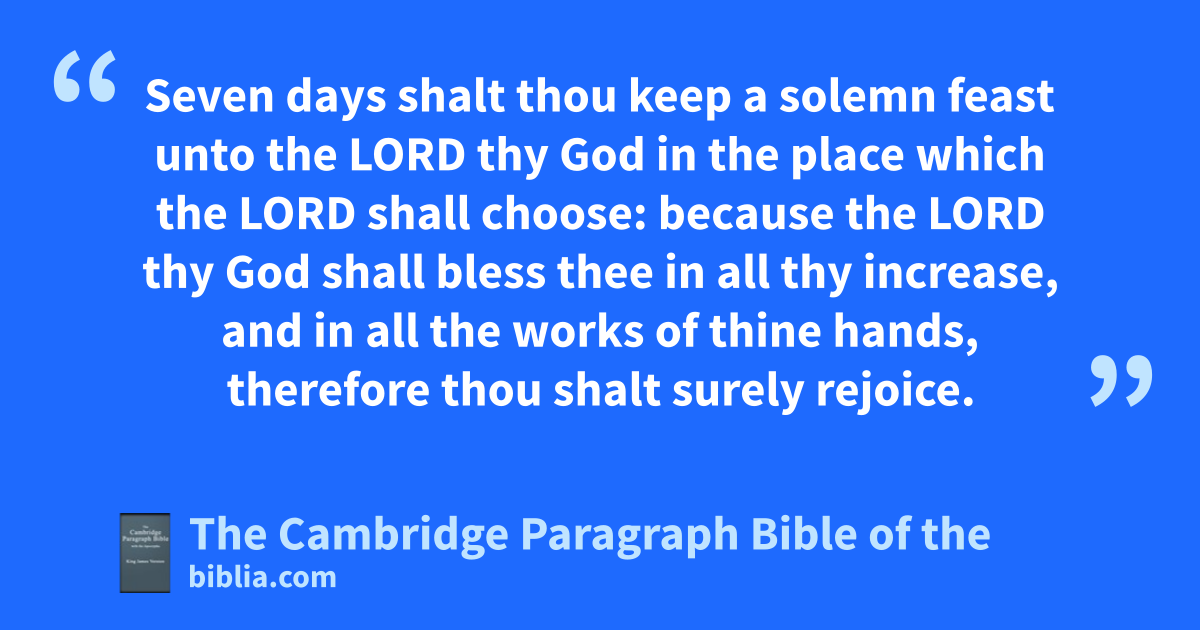 13 rThou shalt observe the feast of tabernacles seven days, after that thou hast gathered in thy * corn and thy wine: 14 and sthou shalt rejoice in thy feast, thou, and thy son, and thy daughter, and thy manservant, and thy maidservant, and the Levite, the stranger, and the fatherless, and the widow, that are within thy gates. 15 tSeven days shalt thou keep a solemn feast unto the Lord thy God in the place which the Lord shall choose: because the Lord thy God shall bless thee in all thy increase, and in all the works of thine hands, therefore thou shalt surely rejoice. 16 uThree times in a year shall all thy males appear before the Lord thy God in the place which he shall choose; in the feast of unleavened bread, and in the feast of weeks, and in the feast of tabernacles: and xthey shall not appear before the Lord empty: 17 every man shall give * as he is able, yaccording to the blessing of the Lord thy God which he hath given thee.