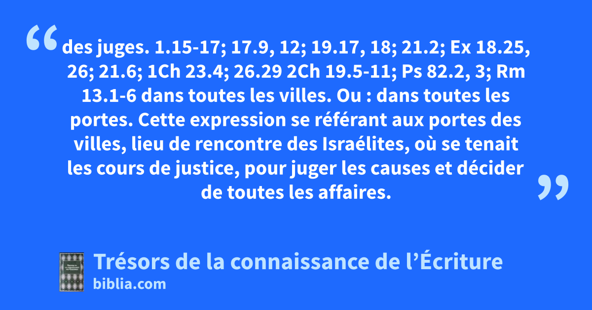 des juges. 1.15-17; 17.9, 12; 19.17, 18; 21.2; Ex 18.25, 26; 21.6; 1Ch 23.4; 26.29 2Ch 19.5-11; Ps 82.2, 3; Rm 13.1-6 dans toutes les villes. Ou : dans toutes les portes. Cette expression se référant aux portes des villes, lieu de rencontre des Israélites, où se tenait les cours de justice, pour juger les causes et décider de toutes les affaires.