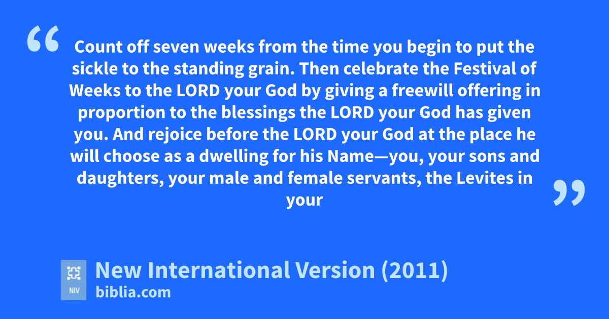 9 Count off seven weeksg from the time you begin to put the sickle to the standing grain.h 10 Then celebrate the Festival of Weeks to the Lord your God by giving a freewill offering in proportion to the blessings the Lord your God has given you. 11 And rejoicei before the Lord your God at the place he will choose as a dwelling for his Namej—you, your sons and daughters, your male and female servants, the Levitesk in your towns, and the foreigners,l the fatherless and the widows living among you.m 12 Remember that you were slaves in Egypt,n and follow carefully these decrees.