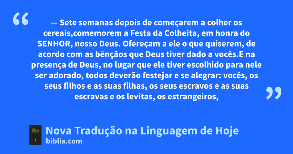 9 — Sete semanas depois de começarem a colher os cereais,10 comemorem a * Festa da Colheita, em honra do Senhor, nosso Deus. Ofereçam a ele o que quiserem, de acordo com as bênçãos que Deus tiver dado a vocês.11 E na presença de Deus, no lugar que ele tiver escolhido para nele ser adorado, todos deverão festejar e se alegrar: vocês, os seus filhos e as suas filhas, os seus escravos e as suas escravas e os * levitas, os estrangeiros, os órfãos e as viúvas que moram nas cidades onde vocês vivem.12 Não esqueçam que vocês foram escravos no Egito; obedeçam fielmente a essas * leis.81