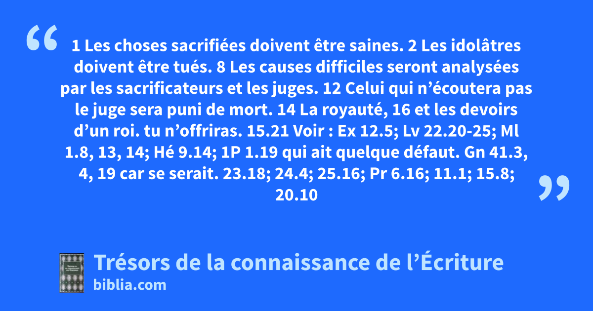 1 Les choses sacrifiées doivent être saines. 2 Les idolâtres doivent être tués. 8 Les causes difficiles seront analysées par les sacrificateurs et les juges. 12 Celui qui n’écoutera pas le juge sera puni de mort. 14 La royauté, 16 et les devoirs d’un roi.