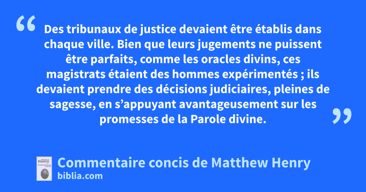 Des tribunaux de justice devaient être établis dans chaque ville. Bien que leurs jugements ne puissent être parfaits, comme les oracles divins, ces magistrats étaient des hommes expérimentés ; ils devaient prendre des décisions judiciaires, pleines de sagesse, en s’appuyant avantageusement sur les promesses de la Parole divine.