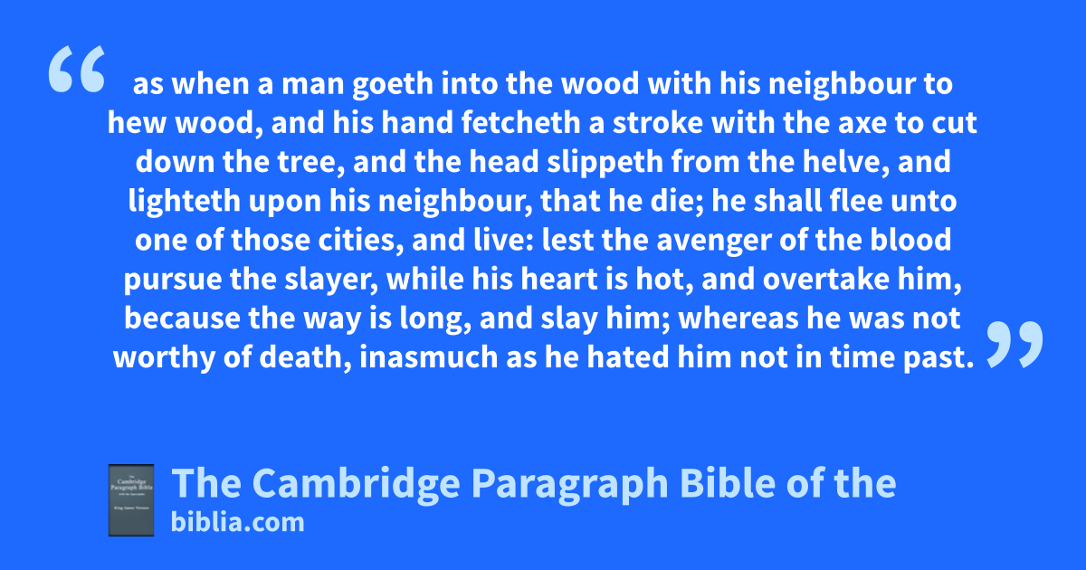 XIX. When athe Lord thy God hath cut off the nations, whose land the Lord thy God giveth thee, and thou * succeedest them, and dwellest in their cities, and in their houses; 2 bthou shalt separate three cities for thee in the midst of thy land, which the Lord thy God giveth thee to possess it. 3 Thou shalt prepare thee a way, and divide the coasts of thy land, which the Lord thy God giveth thee to inherit, into three parts, that every slayer may flee thither. 4 And this is the case of the slayer, which shall flee thither, that he may live: cWhoso killeth his neighbour ignorantly, whom he hated not * in time past; 5 as when a man goeth into the wood with his neighbour to hew wood, and his hand fetcheth a stroke with the axe to cut down the tree, and the * head slippeth from the * helve, and * lighteth upon his neighbour, that he die; he shall flee unto one of those cities, and live: 6 lest dthe avenger of the blood pursue the slayer, while his heart is hot, and overtake him, because the way is long, and * slay him; whereas he was not worthy of death, inasmuch as he hated him not * in time past. 7 Wherefore I command thee, saying, Thou shalt separate three cities for thee. 8 eAnd if the Lord thy God eenlarge thy coast, as he hath sworn unto thy fathers, and fgive thee all the land which he promised to give unto thy fathers; 9 if thou shalt keep all these commandments to do them, which I command thee this day, to love the Lord thy God, and to walk ever in his ways; gthen shalt thou add three cities moe for thee, beside these three: 10 that innocent blood be not shed in thy land, which the Lord thy God giveth thee for an inheritance, and so blood be upon thee. 11 But hif any man hate his neighbour, and lie in wait for him, and rise up against him, and smite him * mortally that he die, and fleeth into one of these cities: 12 then the elders of his city shall send and fetch him thence, and deliver him into the hand of the avenger of blood, that he may die. 13 iThine eye shall not pity him, jbut thou shalt put away the guilt of innocent blood from Israel, that it may go well with thee.