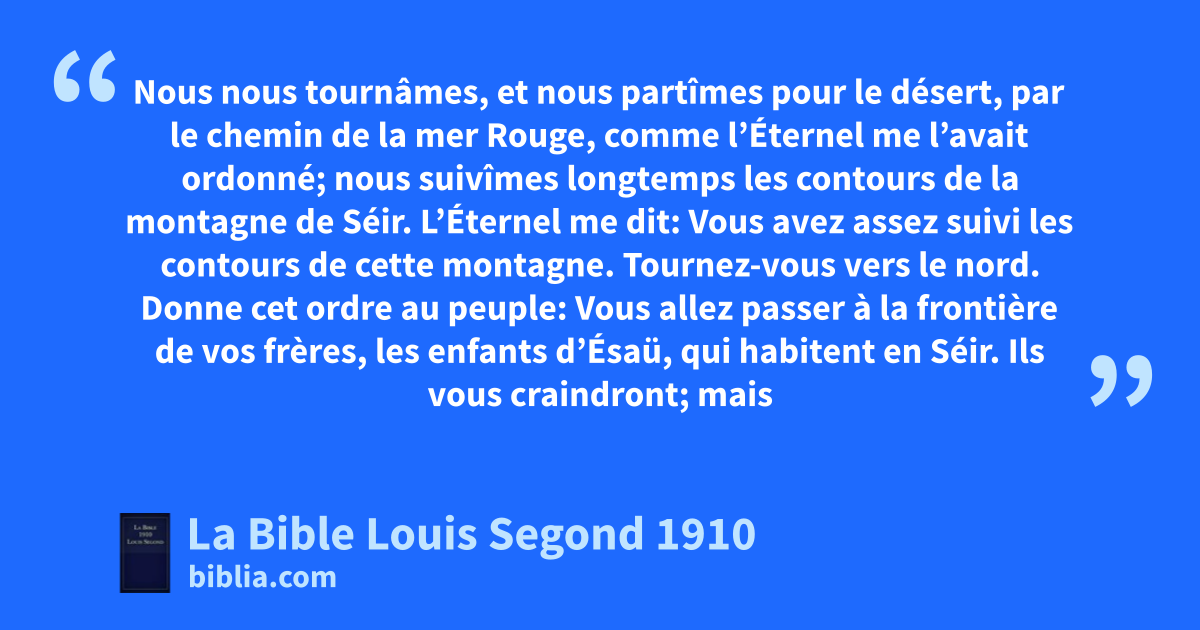 1Nous nous tournâmes, et nous partîmes pour le désert, par le chemin de la mer Rouge, comme l’Éternel me l’avait ordonné; nous suivîmes longtemps les contours de la montagne de Séir. 2L’Éternel me dit: 3Vous avez assez suivi les contours de cette montagne. Tournez-vous vers le nord. 4Donne cet ordre au peuple: Vous allez passer à la frontière de vos frères, les enfants d’Ésaü, qui habitent en Séir. Ils vous craindront; mais soyez bien sur vos gardes. 5Ne les attaquez pas; car je ne vous donnerai dans leur pays pas même de quoi poser la plante du pied: j’ai donné la montagne de Séir en propriété à aÉsaü. 6Vous achèterez d’eux à prix d’argent la nourriture que vous mangerez, et vous achèterez d’eux à prix d’argent même l’eau que vous boirez. 7Car l’Éternel, ton Dieu, t’a béni dans tout le travail de tes mains, il a connu ta marche dans ce grand désert. Voilà quarante années que l’Éternel, ton Dieu, est avec toi: tu n’as manqué de rien. 8Nous passâmes à distance de nos frères, les enfants d’Ésaü, qui habitent en Séir, et à distance du chemin de la plaine, d’Élath et d’Etsjon-Guéber, puis nous nous tournâmes, et nous prîmes la direction du désert de Moab.