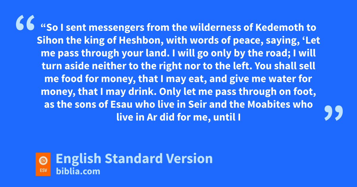 26 “So I sent messengers from the wilderness of pKedemoth to Sihon the king of mHeshbon, qwith words of peace, saying, 27 r‘Let me pass through your land. I will go only by the road; I will turn aside neither to the right nor to the left. 28 sYou shall sell me food for money, that I may eat, and give me water for money, that I may drink. Only let me pass through on foot, 29 tas the sons of Esau who live in Seir and the Moabites who live in Ar did for me, until I go over the Jordan into the land that the Lord our God is giving to us.’ 30 But uSihon the king of mHeshbon would not let us pass by him, for the Lord your God vhardened his spirit and made his heart obstinate, that he might give him into your hand, as he is this day. 31 And the Lord said to me, ‘Behold, I have begun to give Sihon and his land over to you. Begin to take possession, that you may occupy his land.’ 32 Then wSihon came out against us, he and all his people, to battle at Jahaz. 33 And xthe Lord our God gave him over to us, and ywe defeated him and his sons and all his people. 34 And we captured all his cities at that time and devoted to destruction2 every zcity, men, women, and children. We left no survivors. 35 Only the livestock we took as spoil for ourselves, with the plunder of the cities that we captured. 36 aFrom Aroer, which is on the edge of the Valley of the Arnon, and from bthe city that is in the valley, as far as Gilead, there was not a city too high for us. cThe Lord our God gave all into our hands. 37 Only to the land of the sons of Ammon you did not draw near, that is, to all the banks of the river dJabbok and the cities of the hill country, whatever the Lord our God had forbidden us.