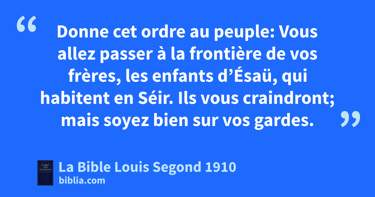 1Nous nous tournâmes, et nous partîmes pour le désert, par le chemin de la mer Rouge, comme l’Éternel me l’avait ordonné; nous suivîmes longtemps les contours de la montagne de Séir. 2L’Éternel me dit: 3Vous avez assez suivi les contours de cette montagne. Tournez-vous vers le nord. 4Donne cet ordre au peuple: Vous allez passer à la frontière de vos frères, les enfants d’Ésaü, qui habitent en Séir. Ils vous craindront; mais soyez bien sur vos gardes. 5Ne les attaquez pas; car je ne vous donnerai dans leur pays pas même de quoi poser la plante du pied: j’ai donné la montagne de Séir en propriété à aÉsaü. 6Vous achèterez d’eux à prix d’argent la nourriture que vous mangerez, et vous achèterez d’eux à prix d’argent même l’eau que vous boirez. 7Car l’Éternel, ton Dieu, t’a béni dans tout le travail de tes mains, il a connu ta marche dans ce grand désert. Voilà quarante années que l’Éternel, ton Dieu, est avec toi: tu n’as manqué de rien. 8Nous passâmes à distance de nos frères, les enfants d’Ésaü, qui habitent en Séir, et à distance du chemin de la plaine, d’Élath et d’Etsjon-Guéber, puis nous nous tournâmes, et nous prîmes la direction du désert de Moab.