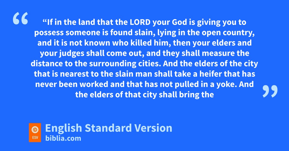 21 “If in the land that the Lord your God is giving you to possess someone is found slain, lying in the open country, and it is not known who killed him, 2 then your elders and your judges shall come out, and they shall measure the distance to the surrounding cities. 3 And the elders of the city that is nearest to the slain man shall take a heifer zthat has never been worked and that has not pulled in a yoke. 4 And the elders of that city shall bring the heifer down to a valley with running water, which is neither plowed nor sown, and shall break the heifer’s neck there in the valley. 5 Then the priests, the sons of Levi, shall come forward, for the Lord your God has chosen athem to minister to him and to bless in the name of the Lord, and bby their word every dispute and every assault shall be settled. 6 And all the elders of that city nearest to the slain man cshall wash their hands over the heifer whose neck was broken in the valley, 7 and they shall testify, ‘Our hands did not shed this blood, nor did our eyes see it shed. 8 Accept atonement, O Lord, for your people Israel, whom you have redeemed, and ddo not set the guilt of innocent blood in the midst of your people Israel, so that their blood guilt be atoned for.’ 9 So eyou shall purge the guilt of innocent blood from your midst, when you do what is right in the sight of the Lord.