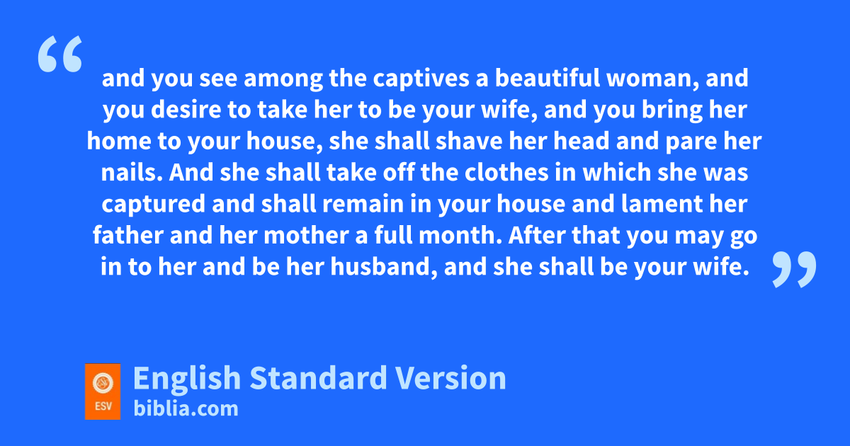 10 “When you go out to war against your enemies, and the Lord your God gives them into your hand and you take them captive, 11 and you see among the captives a beautiful woman, and you desire to take her to be your wife, 12 and you bring her home to your house, she shall shave her head and pare her nails. 13 And she shall take off the clothes in which she was captured and shall remain in your house and flament her father and her mother a full month. After that you may go in to her and be her husband, and she shall be your wife. 14 But if you no longer delight in her, you shall glet her go where she wants. But you shall not sell her for money, nor shall you htreat her as a slave, since you have humiliated her.