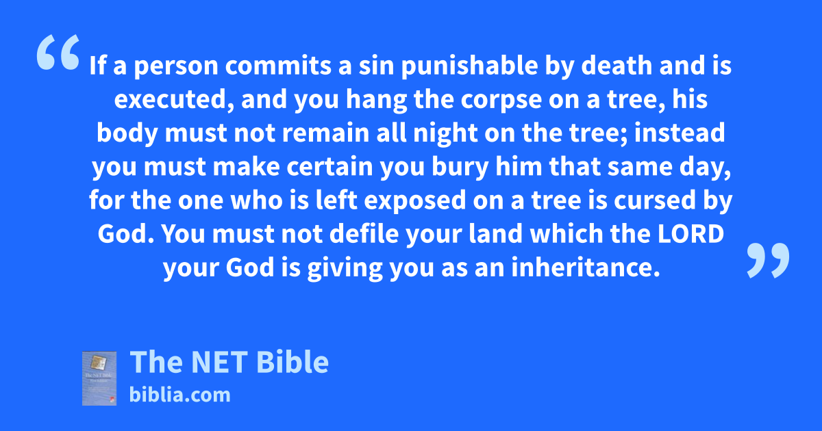 21:22 If a person commits a sin punishable by death and is executed, and you hang the corpse41 on a tree, 21:23 his body must not remain all night on the tree; instead you must make certain you bury42 him that same day, for the one who is left exposed43 on a tree is cursed by God.44 You must not defile your land which the Lord your God is giving you as an inheritance.