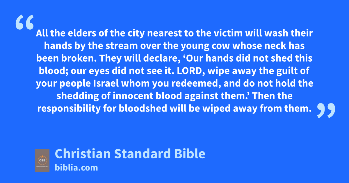 21 “If a murder victim is found lying in a field in the land the Lord your God is giving you to possess, and it is not known who killed him, 2 your elders and judges are to come out and measure the distance from the victim to the nearby cities. 3 The elders of the city nearest to the victim are to get a young cow that has not been yoked or used for work. 4 The elders of that city will bring the cow down to a continually flowing stream, to a place not tilled or sown, and they will break its neck there by the stream. 5 Then the priests, the sons of Levi, will come forward, for the Lord your God has chosen them to serve him and pronounce blessings in his name, and they are to give a ruling inA every dispute and case of assault. 6 All the elders of the city nearest to the victim will wash their hands by the stream over the young cow whose neck has been broken. 7 They will declare, ‘Our hands did not shed this blood; our eyes did not see it. 8 Lord, wipe away the guilt of your people Israel whom you redeemed, and do not hold the shedding of innocent blood against them.’ Then the responsibility for bloodshed will be wiped away from them. 9 You must purge from yourselves the guilt of shedding innocent blood, for you will be doing what is right in the Lord’s sight.