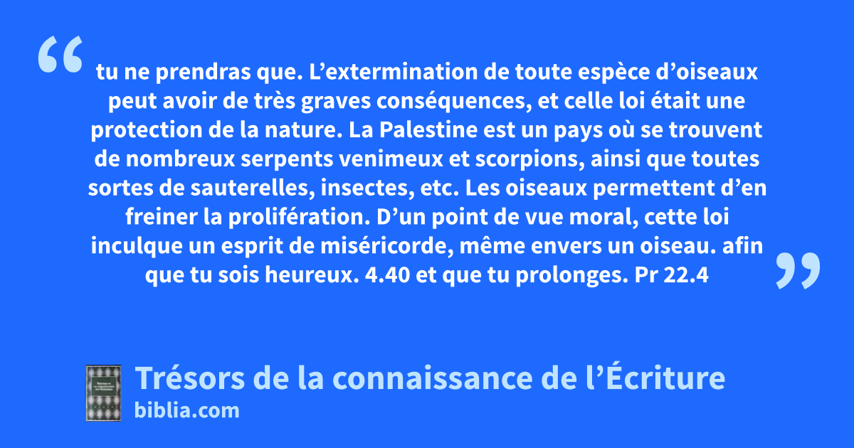 tu ne prendras que. L’extermination de toute espèce d’oiseaux peut avoir de très graves conséquences, et celle loi était une protection de la nature. La Palestine est un pays où se trouvent de nombreux serpents venimeux et scorpions, ainsi que toutes sortes de sauterelles, insectes, etc. Les oiseaux permettent d’en freiner la prolifération. D’un point de vue moral, cette loi inculque un esprit de miséricorde, même envers un oiseau. afin que tu sois heureux. 4.40 et que tu prolonges. Pr 22.4