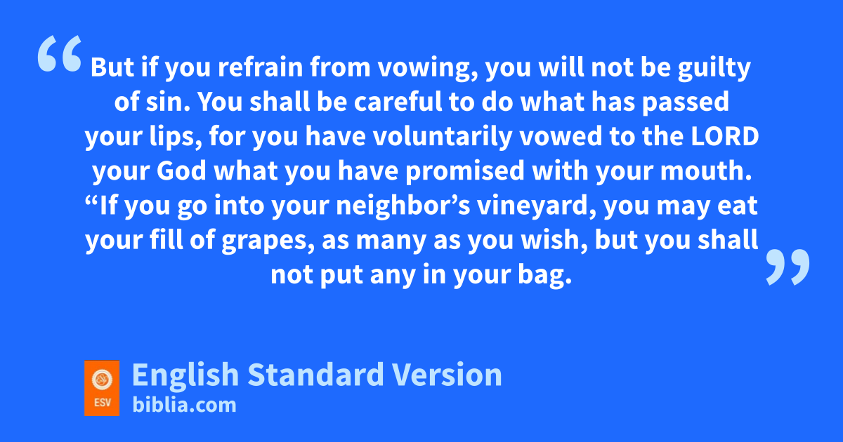 21 c“If you make a vow to the Lord your God, you shall not delay fulfilling it, for the Lord your God will surely require it of you, and you will be guilty of sin. 22 But if you refrain from vowing, you will not be guilty of sin. 23 You shall be careful to do what has passed your lips, for you have voluntarily vowed to the Lord your God what you have promised with your mouth.