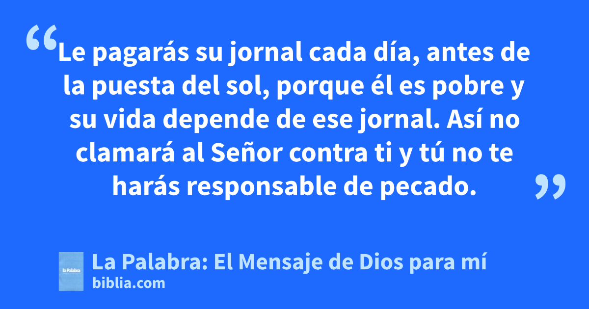 14 No explotarás al jornalero pobre y necesitado, bien se trate de un hermano tuyo israelita o bien de un inmigrante que reside en tu tierra, en tus ciudades. 15 Le pagarás su jornal cada día, antes de la puesta del sol, porque él es pobre y su vida depende de ese jornal. Así no clamará al Señor contra ti y tú no te harás responsable de pecado.