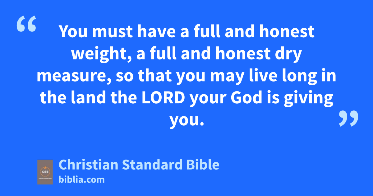 13 “Do not have differing weights in your bag, one heavy and one light.n 14 Do not have differing dry measures in your house, a larger and a smaller. 15 You must have a full and honest weight, a full and honest dry measure, so that you may live long in the land the Lord your God is giving you. 16 For everyone who does such things and acts unfairly is detestable to the Lord your God.a