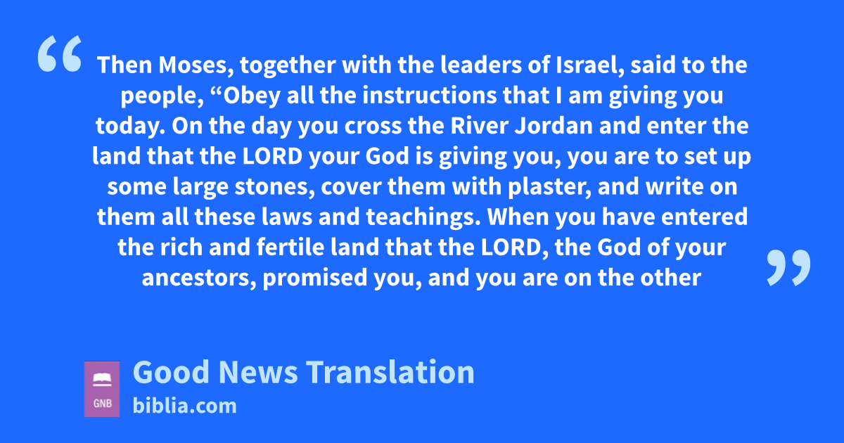 27 Then Moses, together with the leaders of Israel, said to the people, “Obey all the instructions that I am giving you today. 2*On the day you cross the River Jordan and enter the land that the Lord your God is giving you, you are to set up some large stones, cover them with plaster, 3*and write on them all these laws and teachings. When you have entered the rich and fertile land that the Lord, the God of your ancestors, promised you, 4*and you are on the other side of the Jordan, set up these stones on Mount Ebal, as I am instructing you today, and cover them with plaster. 5*Build an altar there made of stones that have had no iron tools used on them, 6*because any altar you build for the Lord your God must be made of uncut stones. There you are to offer the sacrifices that are to be burnt, 7*and there you are to sacrifice and eat your fellowship offerings and be grateful in the presence of the Lord your God. 8*On the stones covered with plaster write clearly every word of God’s laws.”