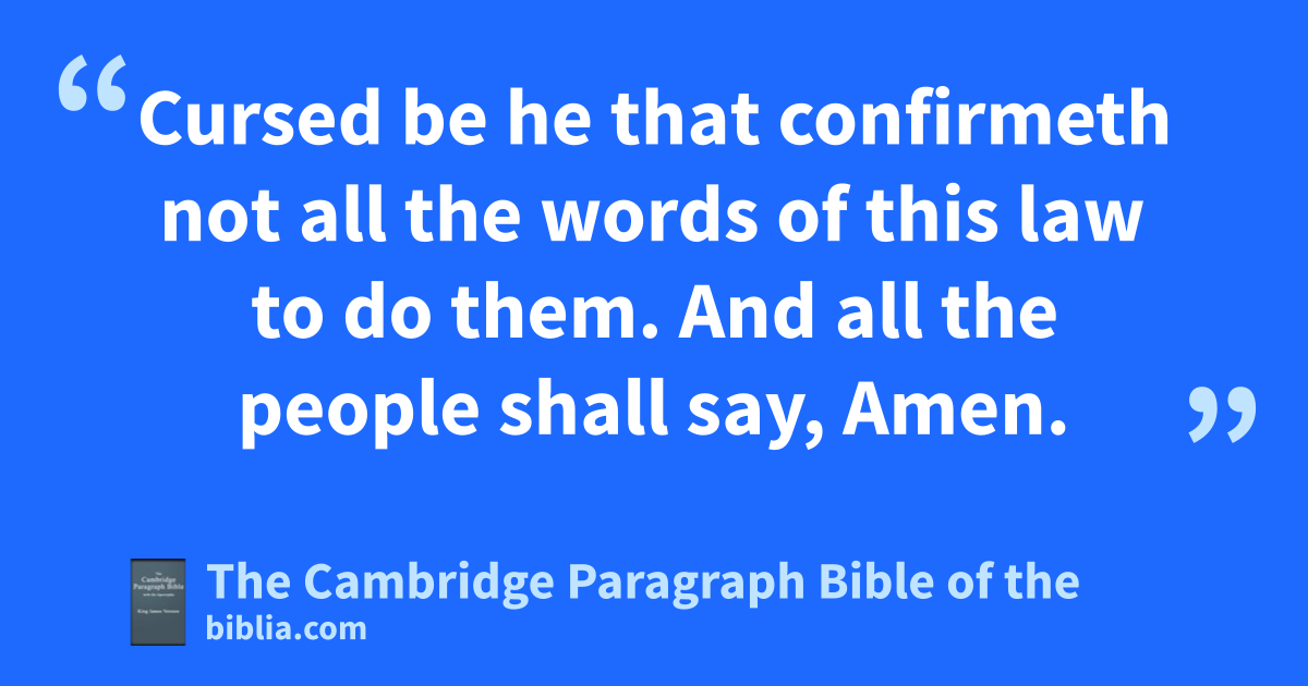 11 And Moses charged the people the same day, saying, 12 gThese shall stand upon mount Gerizzim to bless the people, when ye are come over Jordan; Simeon, and Levi, and Judah, and Issachar, and Joseph, and Benjamin: 13 and gthese shall stand upon mount Ebal * to curse; Reuben, Gad, and Asher, and Zebulun, Dan, and Naphtali. 14 And hthe Levites shall speak, and say unto all the men of Israel with a loud voice, 15 iCursed be the man that maketh any graven or molten image, an abomination unto the Lord, the work of the hands of the craftsman, and putteth it in a secret place. kAnd all the people shall answer and say, Amen. 16 lCursed be he that setteth light by his father or his mother. And all the people shall say, Amen. 17 mCursed be he that removeth his neighbour’s landmark. And all the people shall say, Amen. 18 nCursed be he that maketh the blind to wander out of the way. And all the people shall say, Amen. 19 oCursed be he that perverteth the judgment of the stranger, fatherless, and widow. And all the people shall say, Amen. 20 pCursed be he that lieth with his father’s wife; because he uncovereth qhis father’s skirt. And all the people shall say, Amen. 21 rCursed be he that lieth with any manner of beast. And all the people shall say, Amen. 22 sCursed be he that lieth with his sister, the daughter of his father, or the daughter of his mother. And all the people shall say, Amen. 23 tCursed be he that lieth with his mother in law. And all the people shall say, Amen. 24 uCursed be he that smiteth his neighbour secretly. And all the people shall say, Amen. 25 wCursed be he that taketh reward to slay an innocent person. And all the people shall say, Amen. 26 xCursed be he that confirmeth not all the words of this law to do them. And all the people shall say, Amen.