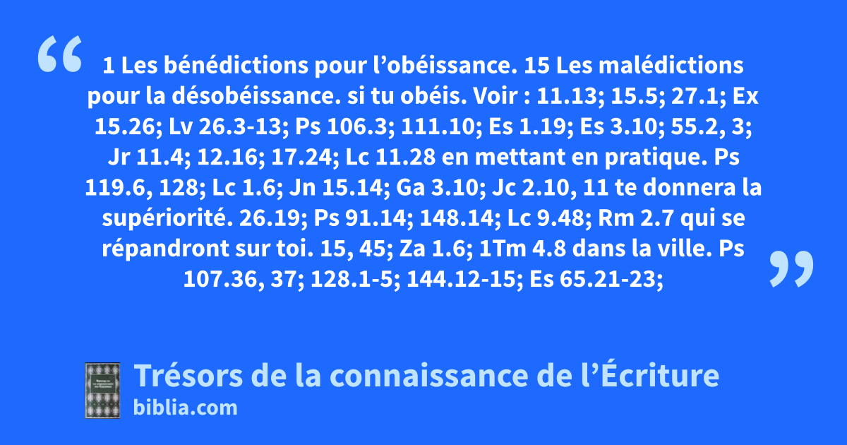 si tu obéis. Voir : 11.13; 15.5; 27.1; Ex 15.26; Lv 26.3-13; Ps 106.3; 111.10; Es 1.19; Es 3.10; 55.2, 3; Jr 11.4; 12.16; 17.24; Lc 11.28 en mettant en pratique. Ps 119.6, 128; Lc 1.6; Jn 15.14; Ga 3.10; Jc 2.10, 11 te donnera la supériorité. 26.19; Ps 91.14; 148.14; Lc 9.48; Rm 2.7