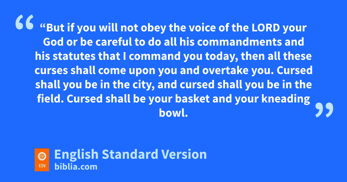 15 “But lif you will not obey the voice of the Lord your God or be careful to do all his commandments and his statutes that I command you today, then all these curses shall come upon you and movertake you. 16 Cursed shall you be nin the city, and cursed shall you be in the field. 17 Cursed shall be your basket and your kneading bowl. 18 Cursed shall be the fruit of your womb and the fruit of your ground, the increase of your herds and the young of your flock. 19 Cursed shall you be when you come in, and cursed shall you be when you go out.