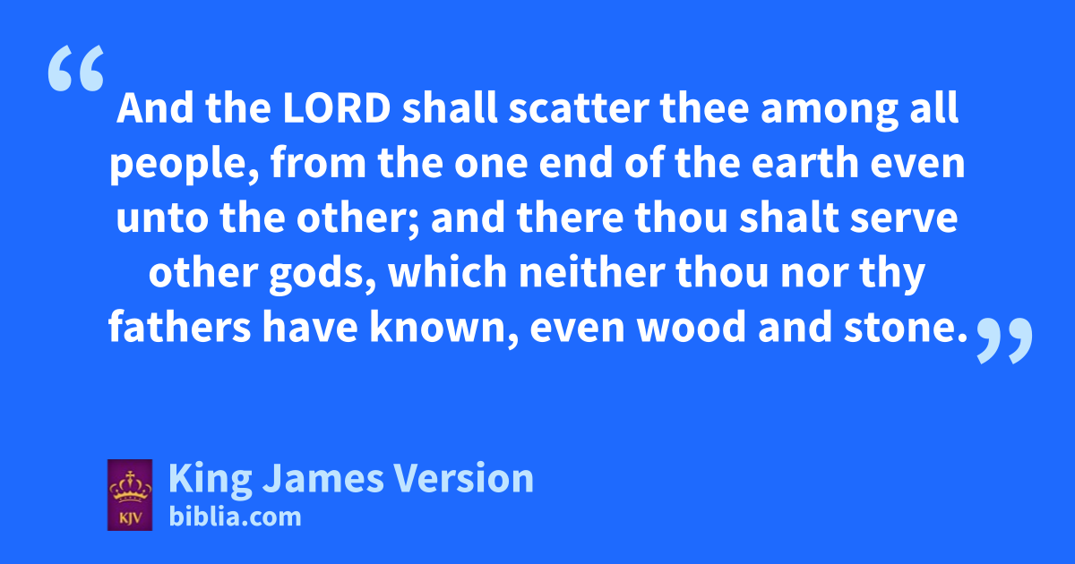 58 If thou wilt not observe to do all the words of this law that are written in this book, that thou mayest fear this glorious and fearful name, yTHE LORD THY GOD; 59 Then the Lord zwill make thy plagues wonderful, and the plagues of thy seed, even great plagues, and of long continuance, and sore sicknesses, and of long continuance. 60 Moreover he will bring upon thee all the adiseases of Egypt, which thou wast afraid of; and they shall cleave unto thee. 61 Also every sickness, and every plague, which is not written in the book of this law, them will the Lord †bring upon thee, until thou be destroyed. 62 And ye shall be left bfew in number, whereas ye were cas the stars of heaven for multitude; because thou wouldest not obey the voice of the Lord thy God. 63 And it shall come to pass, that as the Lord drejoiced over you to do you good, and to multiply you; so the Lord ewill rejoice over you to destroy you, and to bring you to nought; and ye shall be plucked from off the land whither thou goest to possess it. 64 And the Lord fshall scatter thee among all people, from the one end of the earth even unto the other; and gthere thou shalt serve other gods, which neither thou nor thy fathers have known, even wood and stone. 65 And hamong these nations shalt thou find no ease, neither shall the sole of thy foot have rest: ibut the Lord shall give thee there a trembling heart, and kfailing of eyes, and ksorrow of mind: 66 And thy life shall hang in doubt before thee; and thou shalt fear day and night, and shalt have none assurance of thy life: 67 lIn the morning thou shalt say, Would God it were even! and at even thou shalt say, Would God it were morning! for the fear of thine heart wherewith thou shalt fear, and mfor the sight of thine eyes which thou shalt see. 68 And the Lord nshall bring thee into Egypt again with ships, by the way whereof I spake unto thee, oThou shalt see it no more again: and there ye shall be sold unto your enemies for bondmen and bondwomen, and no man shall buy you.