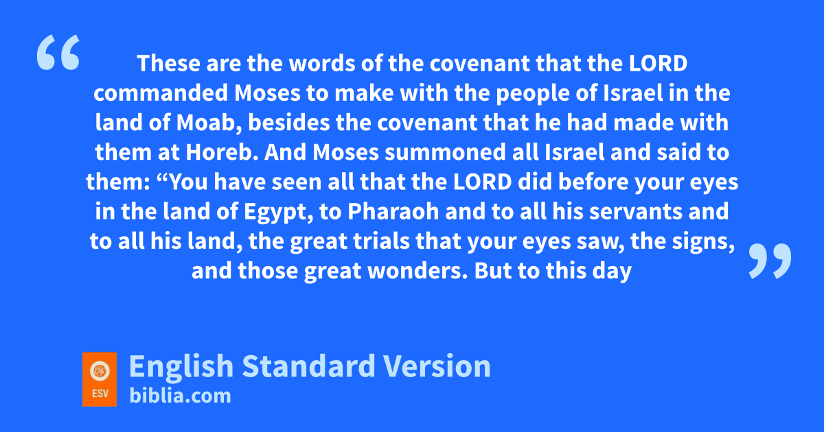2 2 And Moses summoned all Israel and said to them: e“You have seen all that the Lord did before your eyes in the land of Egypt, to Pharaoh and to all his servants and to all his land, 3 the great ftrials that your eyes saw, the signs, and those great wonders. 4 But to this day gthe Lord has not given you a heart to understand or eyes to see or ears to hear. 5 hI have led you forty years in the wilderness. Your clothes have not worn out on you, and your sandals have not worn off your feet. 6 iYou have not eaten bread, and you have not drunk wine or strong drink, that you may know that I am the Lord your God. 7 And when you came to this place, jSihon the king of Heshbon and Og the king of Bashan came out against us to battle, but we defeated them. 8 We took their land and kgave it for an inheritance to the Reubenites, the Gadites, and the half-tribe of the Manassites. 9 lTherefore keep the words of this covenant and do them, that you may prosper3 in all that you do.