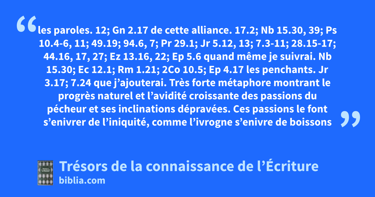les paroles. 12; Gn 2.17 de cette alliance. 17.2; Nb 15.30, 39; Ps 10.4-6, 11; 49.19; 94.6, 7; Pr 29.1; Jr 5.12, 13; 7.3-11; 28.15-17; 44.16, 17, 27; Ez 13.16, 22; Ep 5.6 quand même je suivrai. Nb 15.30; Ec 12.1; Rm 1.21; 2Co 10.5; Ep 4.17 les penchants. Jr 3.17; 7.24 que j’ajouterai. Très forte métaphore montrant le progrès naturel et l’avidité croissante des passions du pécheur et ses inclinations dépravées. Ces passions le font s’enivrer de l’iniquité, comme l’ivrogne s’enivre de boissons fortes, sans en considérer les conséquences.