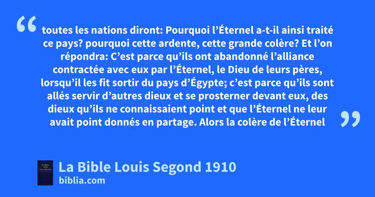 16Vous savez de quelle manière nous avons habité dans le pays d’Égypte, et comment nous avons passé au milieu des nations que vous avez traversées. 17Vous avez vu leurs abominations et leurs idoles, le bois et la pierre, l’argent et l’or, qui sont chez elles. 18Qu’il n’y ait parmi vous ni homme, ni femme, ni famille, ni tribu, dont le coeur se détourne aujourd’hui de l’Éternel, notre Dieu, pour aller servir les dieux de ces nations-là. Qu’il n’y ait point parmi vous de fracine qui produise du poison et de l’absinthe. 19Que personne, après avoir entendu les paroles de cette alliance contractée avec serment, ne se glorifie dans son coeur et ne dise: J’aurai la paix, quand même je suivrai les penchants de mon coeur, et que j’ajouterai l’ivresse à la soif. 20L’Éternel ne voudra point lui pardonner. Mais alors la colère et la jalousie de l’Éternel s’enflammeront contre cet homme, toutes les malédictions écrites dans ce livre reposeront sur lui, et l’Éternel effacera son nom de dessous les cieux. 21L’Éternel le séparera, pour son malheur, de toutes les tribus d’Israël, selon toutes les malédictions de l’alliance écrite dans ce livre de la loi. 22Les générations à venir, vos enfants qui naîtront après vous et l’étranger qui viendra d’une terre lointaine, — à la vue des plaies et des maladies dont l’Éternel aura frappé ce pays, à la vue du soufre, du sel, 23de l’embrasement de toute la contrée, où il n’y aura ni semence, ni produit, ni aucune herbe qui croisse, comme au bouleversement de Sodome, de Gomorrhe, d’Adma et de Tseboïm, que l’Éternel détruisit dans sa colère et dans sa fureur, — 24toutes les nations diront: gPourquoi l’Éternel a-t-il ainsi traité ce pays? pourquoi cette ardente, cette grande colère? 25Et l’on répondra: C’est parce qu’ils ont abandonné l’alliance contractée avec eux par l’Éternel, le Dieu de leurs pères, lorsqu’il les fit sortir du pays d’Égypte; 26c’est parce qu’ils sont allés servir d’autres dieux et se prosterner devant eux, des dieux qu’ils ne connaissaient point et que l’Éternel ne leur avait point donnés en partage. 27Alors la colère de l’Éternel s’est enflammée contre ce pays, et il a fait venir sur lui toutes les malédictions écrites dans ce livre. 28L’Éternel les a arrachés de leur pays avec colère, avec fureur, avec une grande indignation, et il les a jetés sur un autre pays, comme on le voit aujourd’hui. 29Les choses cachées sont à l’Éternel, notre Dieu; les choses révélées sont à nous et à nos enfants, à perpétuité, afin que nous mettions en pratique toutes les paroles de cette loi.