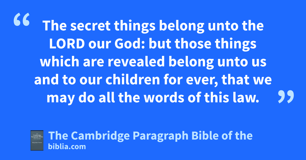 10 Ye stand this day all of you before the Lord your God; your captains of your tribes, your elders, and your lofficers, with all the men of Israel, 11 your little ones, your wives, and thy stranger that is in thy camp, from mthe hewer of thy wood unto the drawer of thy water: 12 that thou shouldest * enter into covenant with the Lord thy God, and into his noath, which the Lord thy God maketh with thee this day: 13 that he may oestablish thee to day for a people unto himself, and that he may be unto thee a God, pas he hath said unto thee, and qas he hath sworn unto thy fathers, to Abraham, to Isaac, and to Jacob. 14 Neither with you only rdo I make this covenant and this noath; 15 but with him that standeth here with us this day before the Lord our God, sand also with him that is not here with us this day: 16 (for ye know how we have dwelt in the land of Egypt; and how we came through the nations which ye passed by; 17 and ye have seen their abominations, and their * idols, wood and stone, silver and gold, which were among them:) 18 lest there should be among you man, or woman, or family, or tribe, whose heart turneth away this day from the Lord our God, to go and serve the gods of these nations; tlest there should be among you a root that beareth * gall and uwormwood; 19 and it come to pass, when he heareth the words of this curse, that he bless himself in his heart, saying, I shall have peace, though I walk in the * imagination of mine heart, xto add * drunkenness to thirst: 20 the Lord will not spare him, but then ythe anger of the Lord and zhis jealousy shall smoke against that man, and all the curses that are written in this book shall lie upon him, and the Lord ashall blot out his name from under heaven. 21 And the Lord shall separate him unto evil out of all the tribes of Israel, according to all the curses of the covenant that * are written in this book of the law: 22 so that the generation to come of your children that shall rise up after you, and the stranger that shall come from a far land, bshall say, when they see the plagues of that land, and the sicknesses * which the Lord hath laid upon it; 23 and that the whole land thereof is brimstone, and csalt, and burning, that it is not sown, nor beareth, nor any grass groweth therein, dlike the overthrow of Sodom, and Gomorrah, Admah, and Zeboim, which the Lord overthrew in his anger, and in his wrath: 24 even all nations eshall say, fWherefore hath the Lord done thus unto this land? what meaneth gthe heat of this great anger? 25 Then men shall say, Because they have forsaken the covenant of the Lord God of their fathers, which he made with them when he brought them forth out of the land of Egypt: 26 for they went and served other gods, and worshipped them, gods whom they knew not, and * whom he had not * given unto them: 27 and the anger of the Lord was kindled against this land, to bring upon it all the curses that are written in this book: 28 and the Lord hrooted them out of their land in anger, and in wrath, and in great indignation, and cast them into another land, as it is this day. 29 The secret things belong unto the Lord our God: but those things which are revealed belong unto us and to our children for ever, that we may do all the words of this law.