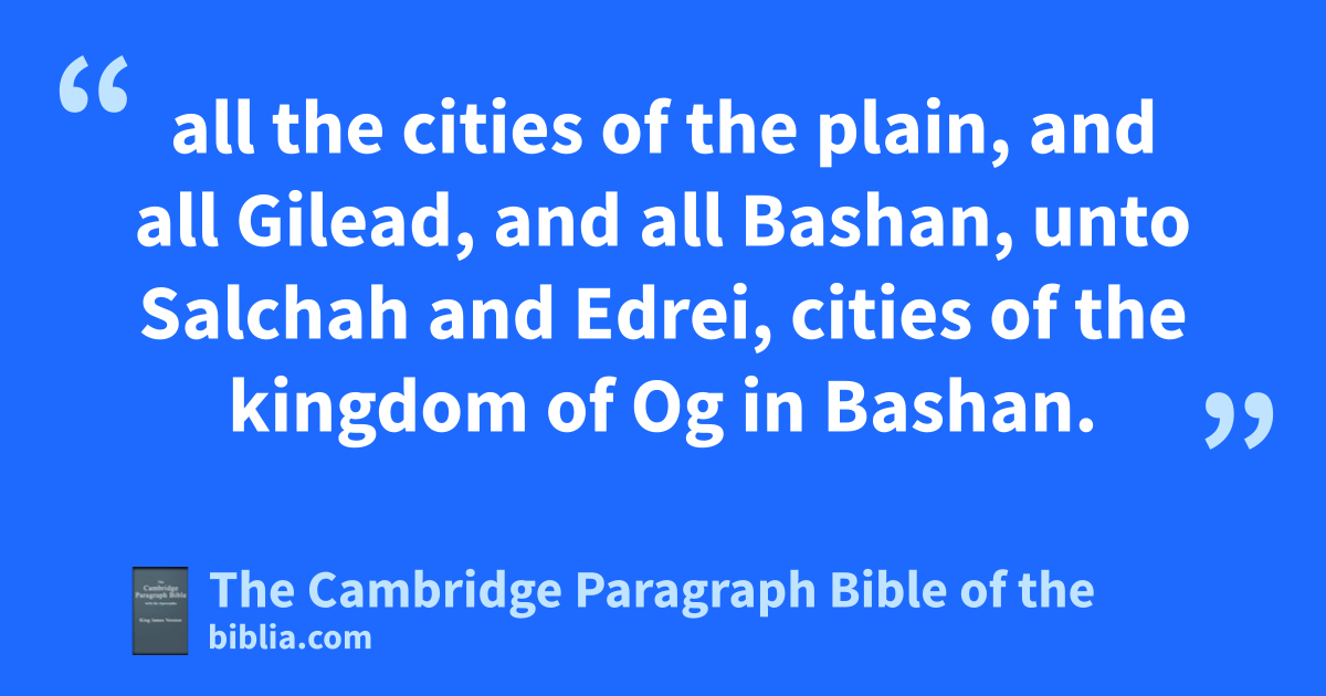 III. Then we turned, and went up the way to Bashan: and aOg the king of Bashan came out against us, he and all his people, to battle bat Edrei. 2 And the Lord said unto me, Fear him not: for I will deliver him, and all his people, and his land, into thy hand; and thou shalt do unto him as thou didst unto cSihon king of the Amorites, which dwelt at Heshbon. 3 So the Lord our God delivered into our hands Og also, the king of Bashan, and all his people: dand we smote him until none was left to him remaining. 4 And we took all his cities at that time, there was not a city which we took not from them, threescore cities, eall the region of Argob, the kingdom of Og in Bashan. 5 All these cities were fenced with high walls, gates, and bars; beside funwalled towns a great many. 6 And we gutterly destroyed them, as we did unto Sihon king hof Heshbon, utterly destroying ithe men, women, and children, of every city. 7 But all the cattle, and the spoil of the cities, we took for a prey to ourselves. 8 And we took at that time out of the hand of the two kings of the Amorites the land that was on this side Jordan, from the river of Arnon unto mount Hermon; 9 (which jHermon the Sidonians call kSirion; and the Amorites call it lShenir;) 10 all the cities of mthe plain, and all Gilead, and all Bashan, unto nSalchah and Edrei, cities of the kingdom of Og in Bashan. 11 For only Og king of Bashan remained of the remnant of ogiants; behold, his bedstead was a bedstead of iron; is it not in pRabbath of the children of Ammon? nine cubits was the length thereof, and four cubits the breadth of it, after the cubit qof a man. 12 And this land, which we possessed at that time, rfrom Aroer, which is by the river Arnon, and half mount Gilead, and sthe cities thereof, gave I unto the Reubenites and to the Gadites. 13 And tthe rest of Gilead, and all Bashan, being the kingdom of Og, gave I unto the half tribe of Manasseh; uall the region of Argob, with all Bashan, which was called the land of xgiants. 14 yJair the son of Manasseh took all the country of Argob unto the coasts of zGeshuri and Maachathi; and called them after his own name, Bashan-yhavoth-jair, unto this day. 15 aAnd I gave Gilead unto Machir. 16 And unto the Reubenites band unto the Gadites I gave from Gilead even unto the river Arnon, half the valley, and the border, even unto the river Jabbok, cwhich is the border of the children of Ammon; 17 the plain also, and Jordan, and the coast thereof, from dChinnereth eeven unto the sea of the plain, feven the salt sea, * under Ashdoth-pisgah eastward.